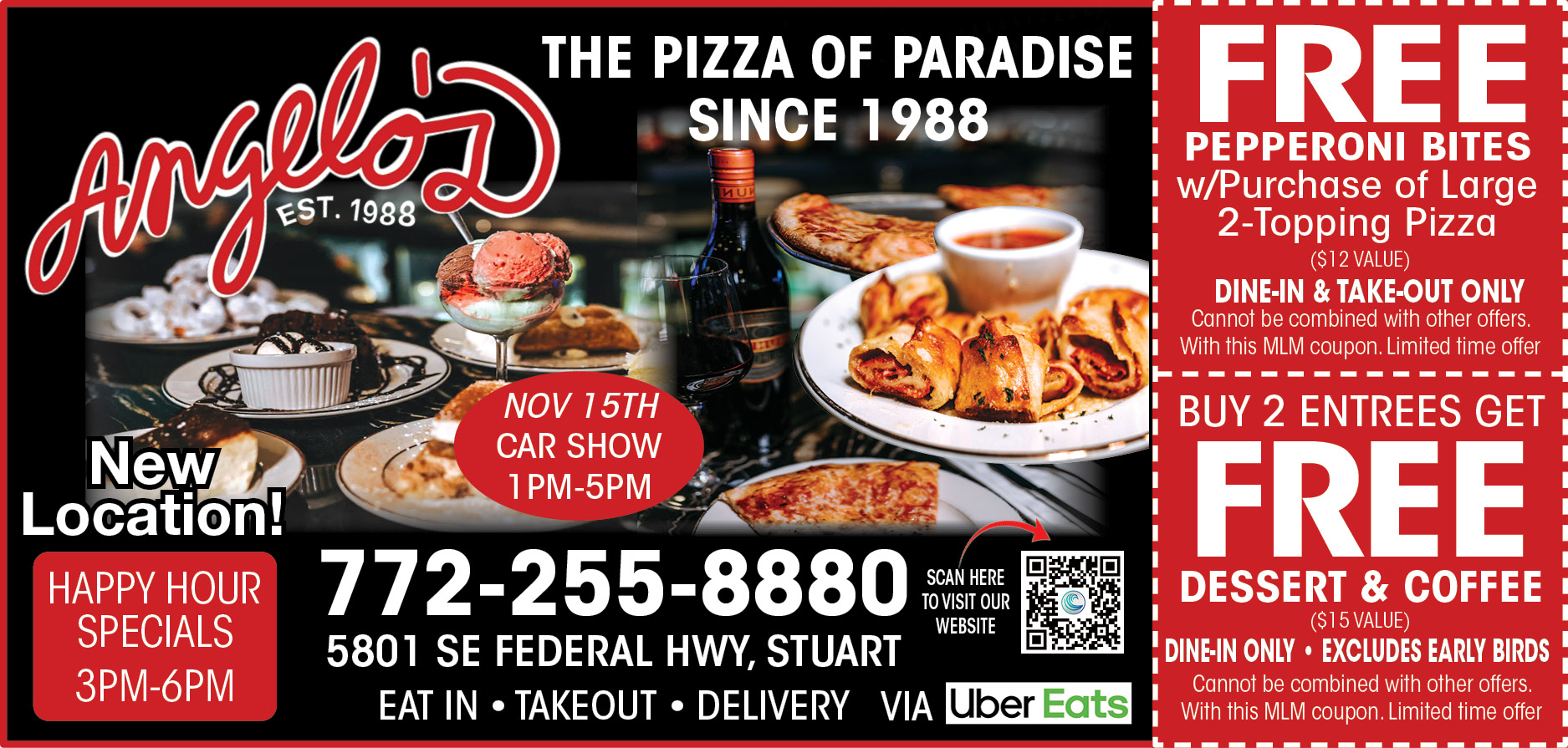 Since 1988, Angelo’s has been serving up the true taste of paradise with authentic, handcrafted pizzas, delicious Italian entrees, and mouthwatering desserts. Now at our new location in Stuart, we continue our tradition of quality, flavor, and family-friendly dining that’s made us a local favorite for decades.