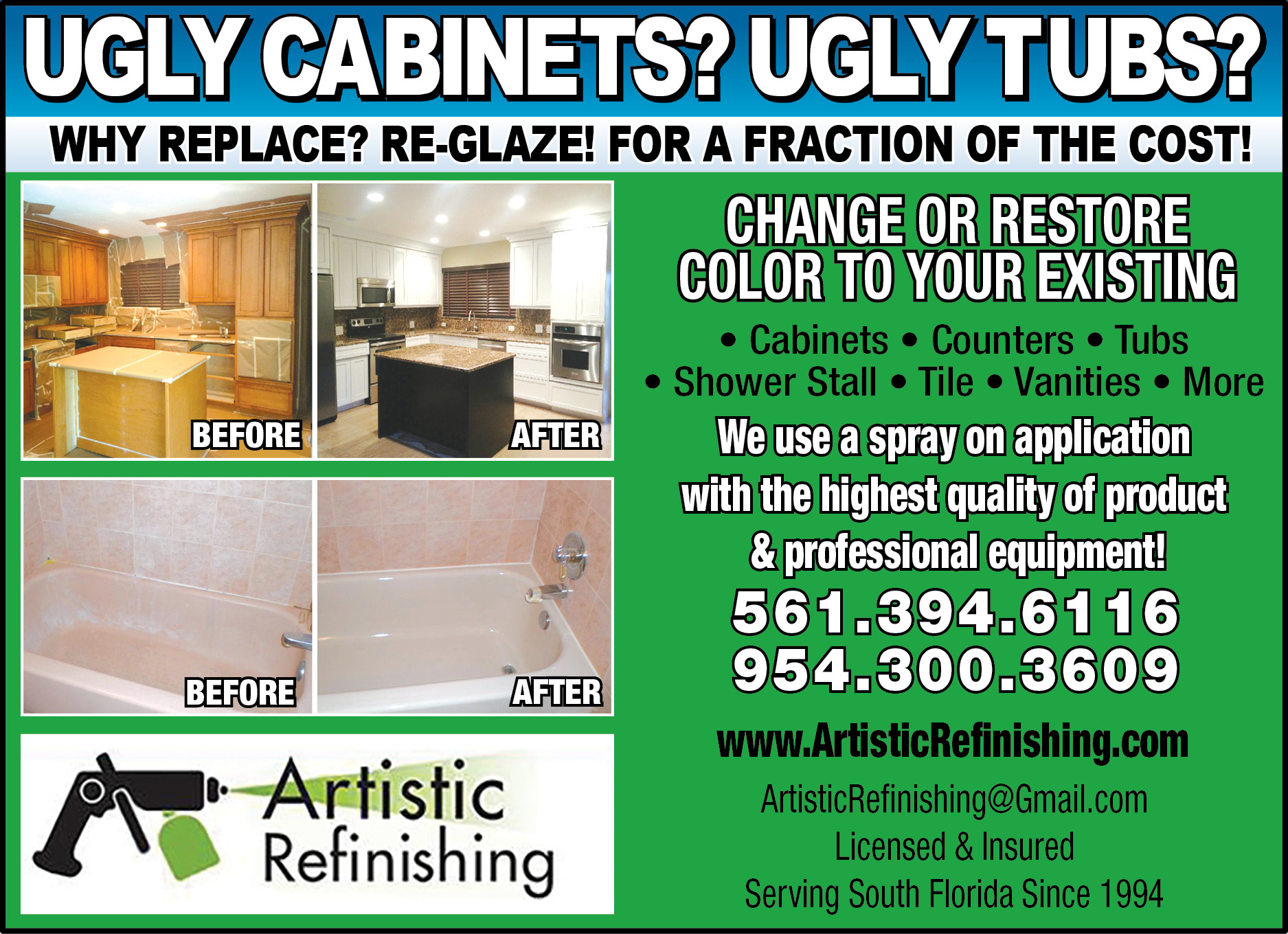 Artistic Refinishing is rated A+ with the BBB, Over 25 years of industry experience, refinishing is the most economical and efficient way to revitalize your Bathroom, Kitchen or Appliances at a mere fraction of the cost of replacement. Using our process at Artistic Refinishing, combined with your original remodeling plan will save you as much as 90% over the cost of replacement ! This huge savings will allow you upgrade the quality of other fixtures and accessories.