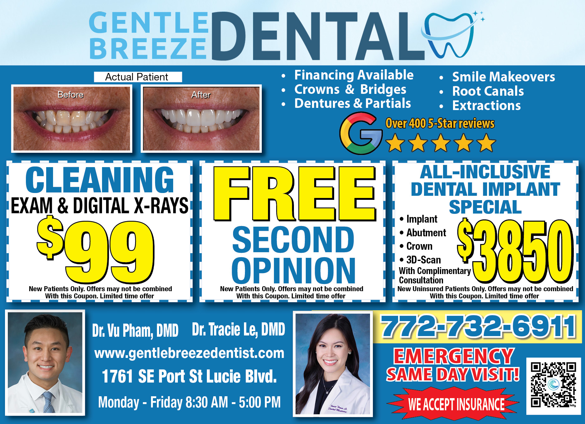 Gentle Breeze Dental in Port St. Lucie, Florida provides routine, restorative, and cosmetic dentistry for adults and children. Whether you visit us for a hygiene appointment or major surgery, you can expect the same compassionate, quality dental care from our staff. Because we understand that some people feel anxious about visiting the dentist, we make sure that you receive care in a friendly environment that is safe and comfortable as well. Our entire staff takes pride in our commitment to patients and to the field of dentistry as a whole.