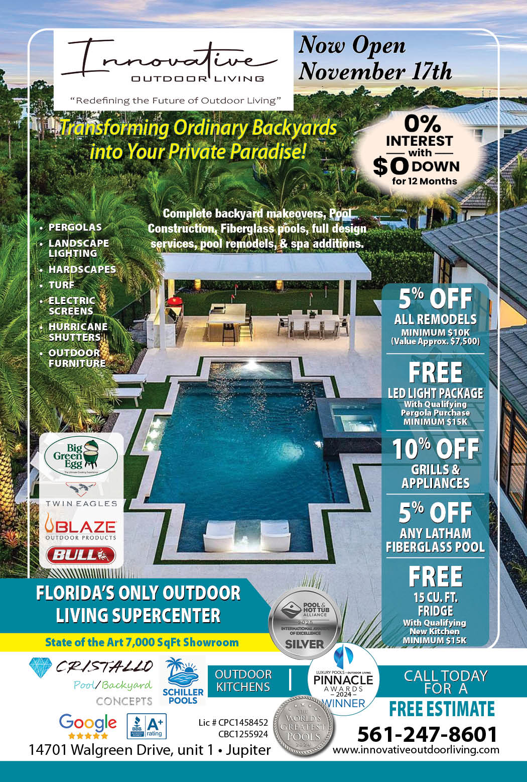 Innovative outdoor living is a true one-stop shop offering luxury services, including innovative design and planning, high-end pool construction, exquisite hardscaping, stunning outdoor kitchens, top-quality pergolas, breathtaking landscaping and lighting, and top-rated hurricane impact windows and doors. Experience the highest level of outdoor living with us.