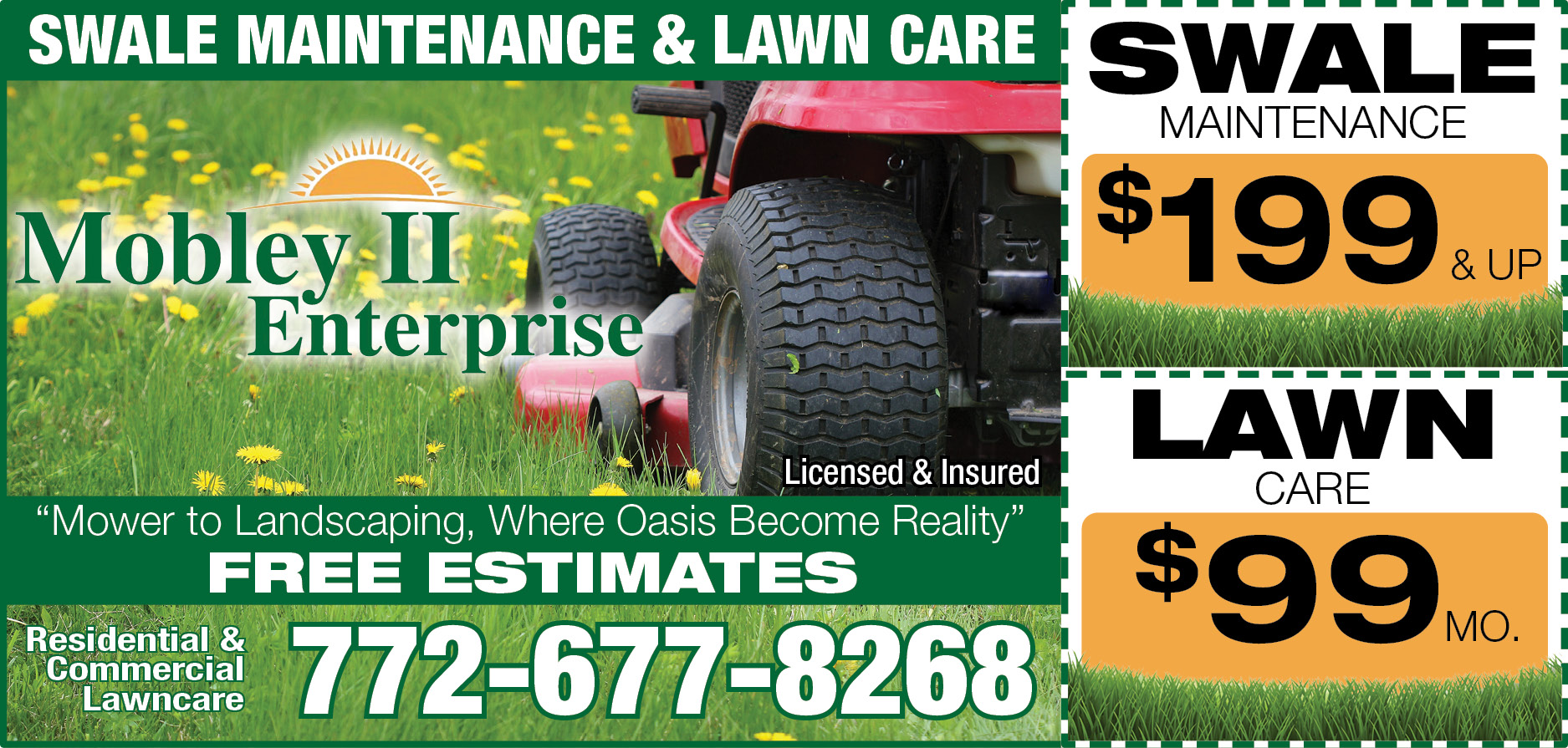 Mobley II Enterprise delivers dependable swale maintenance and lawn care that keeps properties looking fresh, healthy, and beautifully maintained. From routine mowing to full landscaping, they turn everyday yards into inviting outdoor spaces where an oasis starts to take shape. Serving both residential and commercial clients, they’re licensed, insured, and committed to quality work at fair pricing backed by free estimates and service that comes with a neighborly touch.