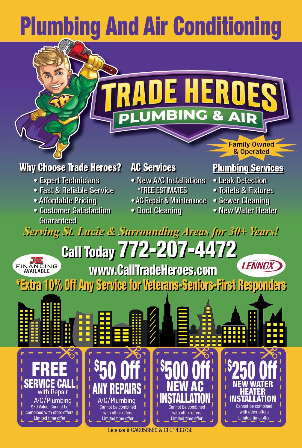 Trade Heroes has you covered! Why choose us? We have expert technicians, provide fast & reliable services, & affordable pricing. We do leak detections, sewer cleaning, new water heaters, new A/C installations, AC repairs, maintenance, duct cleaning, and so much more! Trade Heroes has been serving St. Lucie & surrounding areas for over 30 years. Call today to get started!